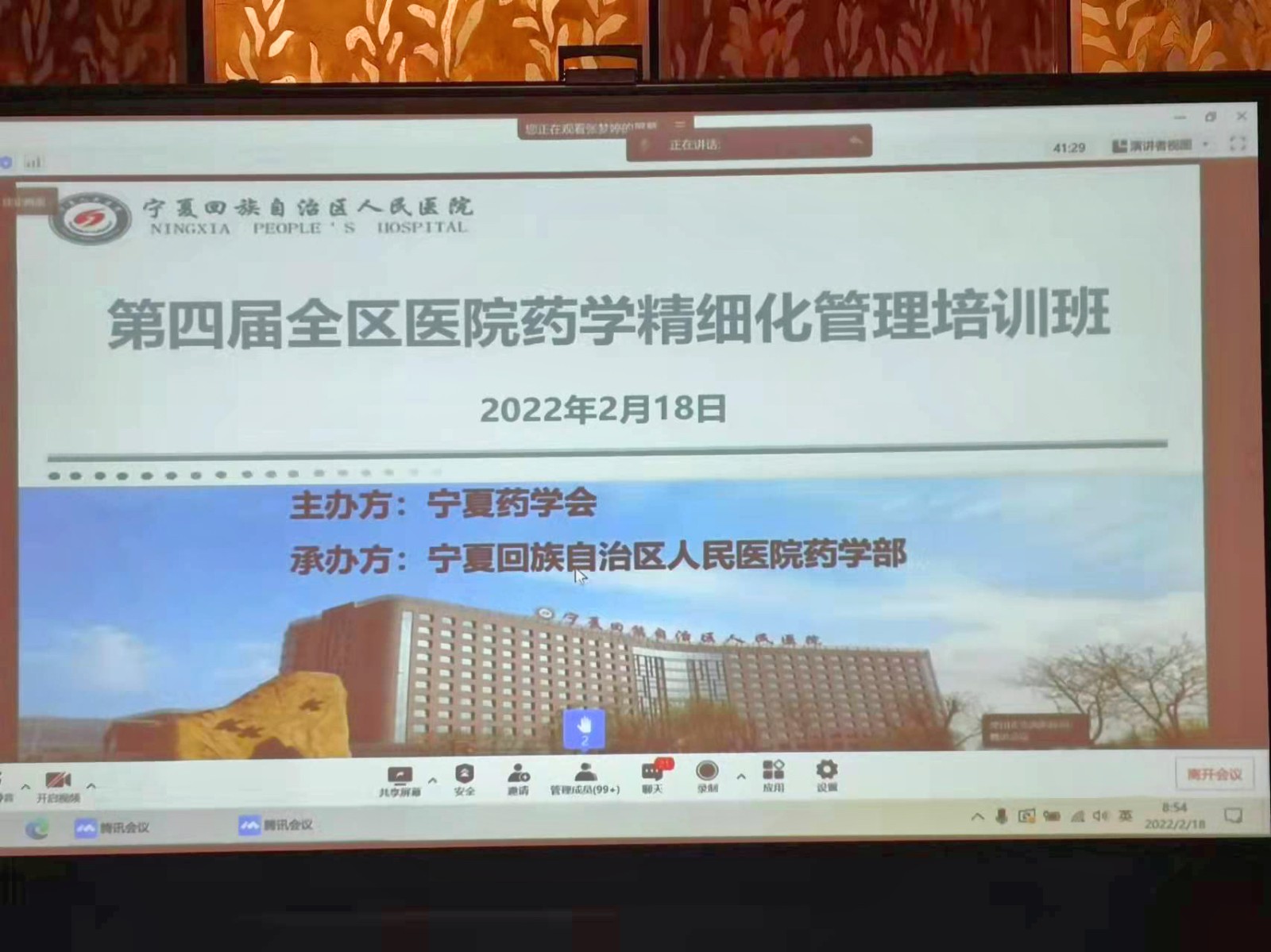 为进一步加强全区医院药学学术交流,提高医院药学管理的科学化、规范化水平,由宁夏回族自治区药学会主办,宁夏回族自治区人民医院药学部承办的《第四届全区医院药学精细化管理培训班》于2022年2月18日顺利召开。本次会议采取线上、线下相结合的方式进行,开幕式由我院物资储备供应中心黄文华主任主持,宁夏药学会理事长韩义欣出席本次开幕式并致辞,宁南医院院长李德银在线上致开幕词。来自区内外各级各类医疗机构药学人员线上、线下近330余人参会。