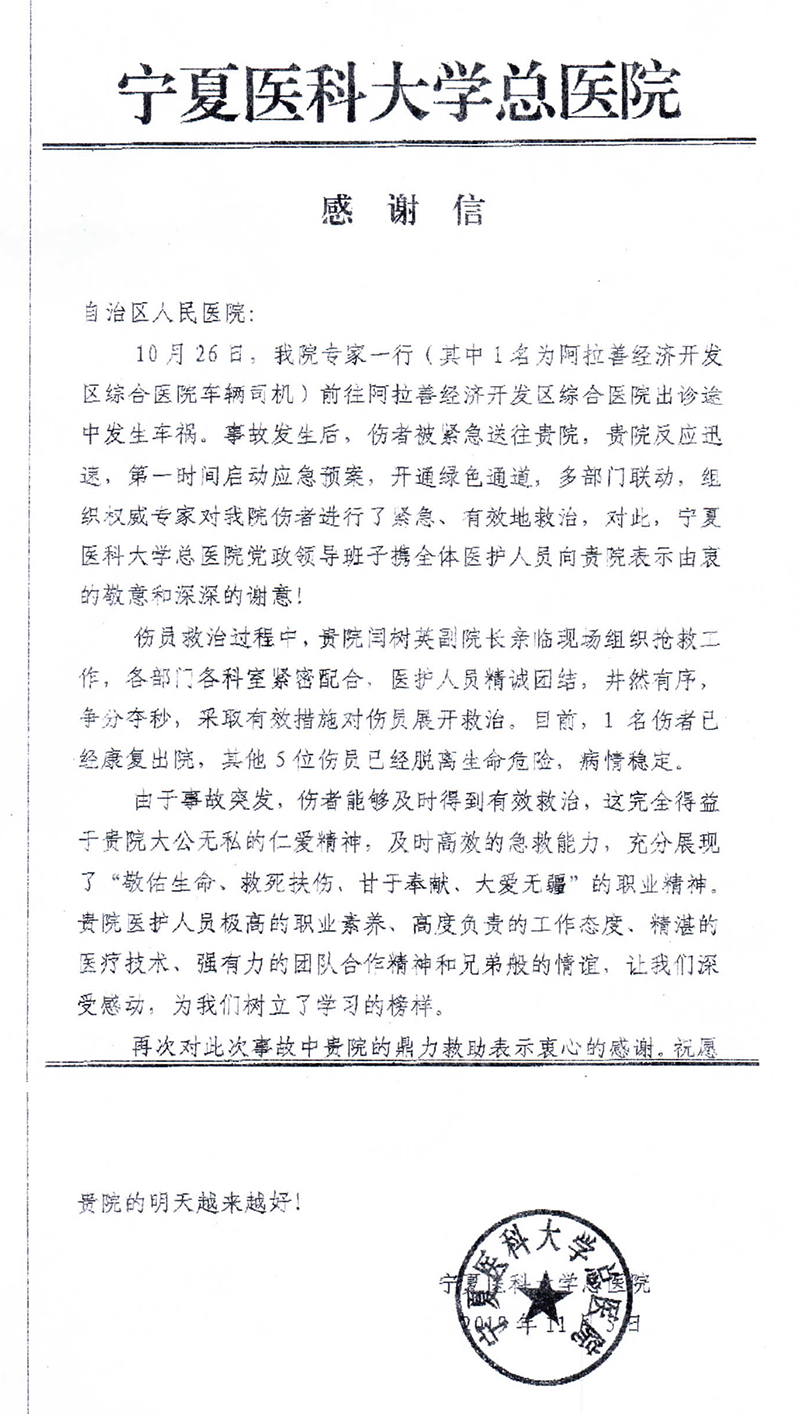 编者按:10月26日,宁夏医科大学总医院专家一行前往阿拉善经济开发区综合医院出诊途中发生车祸,伤者紧急被送往我院后得到救治。宁医大总院对我院医护人员高尚的职业精神和认真负责的工作态度表示感谢。现将感谢信予以发布,供大家学习。