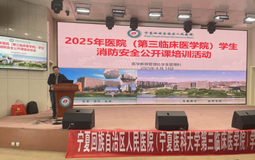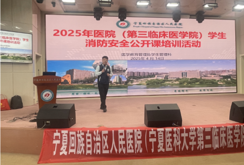 为深入学习贯彻自治区全会精神,树牢安全理念,筑牢安全屏障,守护医院安全人人有责。4月14日下午在行政中心报告厅,医院(第三临床医学院)开展“学消防知识,签安全之名,护万家灯火”主题教育培训。本次培训邀请宁夏为民安消防教育咨询中心陈天麟主讲,在院400余名本科生、研究生及住培学员参加此次培训活动。